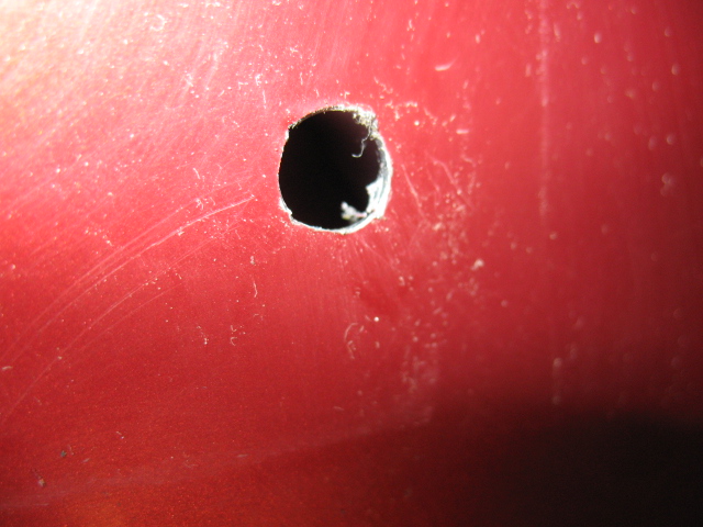 Гайка накручивается на резбовой конец и заводится в отверстие. Сводя два рычага резбовой конец (противоположный фланцу) подтягивается к фланцу, часть тела гайки раздается в стороны, образуя кольцевой выступ и лист зажимается между фланцем и этим выступом. Гайка фиксируется очень надежно! - Гайка с резьбой М6 имеет наружный диаметр пистона 9 мм. Прямо сквозь пластмассовые пистоны сверлим отверстие соотв. диаметром 9 мм. Получается хорошо, от старого прямоугольного остаются едва заметные краешки:
