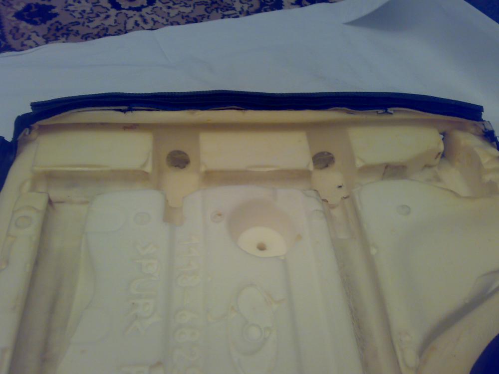 ! В поролоне уже есть выемки для среднего подголовника. Правда, как и в боковых подголовниках эти выемки недостаточны и их приходится чуть углубить и удлинить. Делал я это обычным широким канцелярским ножом со сменными лезвиями.Это стандартные выемки