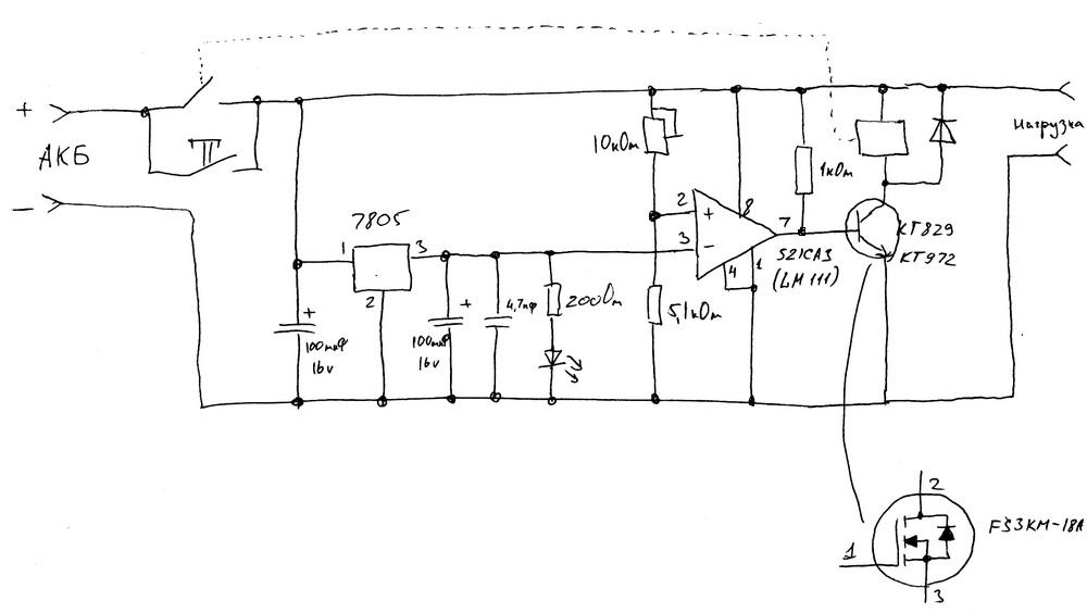 В качестве опорного напряжения использовал микросхему стабилизатора напряжения 7805. Компаратор - 521 СА3. Вместо биполярного транзистора я использовал полевик FS3KM-18A. Почему я выбрал эти элементы? Да потому, что на работе полно всяких схем и оттуда я некоторые выпаял. Некоторые просто валялись в столе. Короче на схему я ничего не потратил, кроме своего времени.