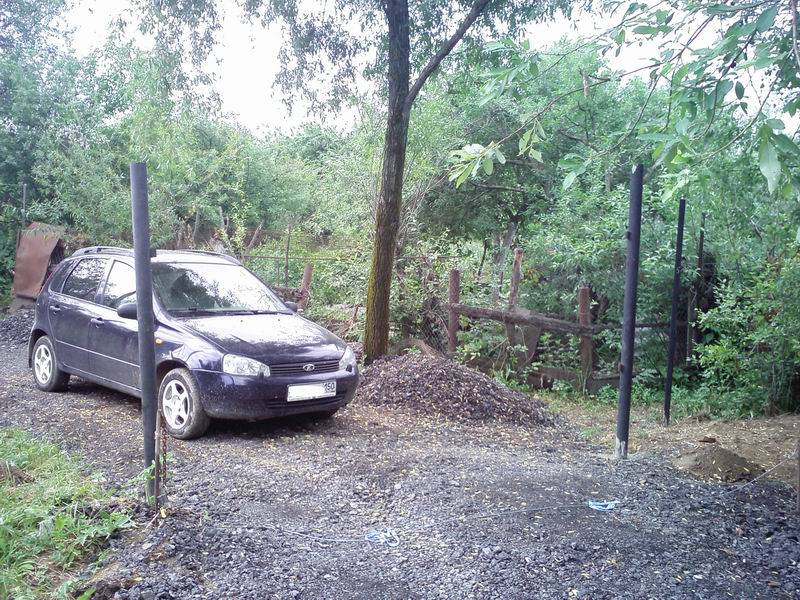 Установили столбы, выровняли по вертикали, горизонтали и по веревочке. Утрамбовали камнями. Но с погодой не повезло и бетон я мешал под дождиком.