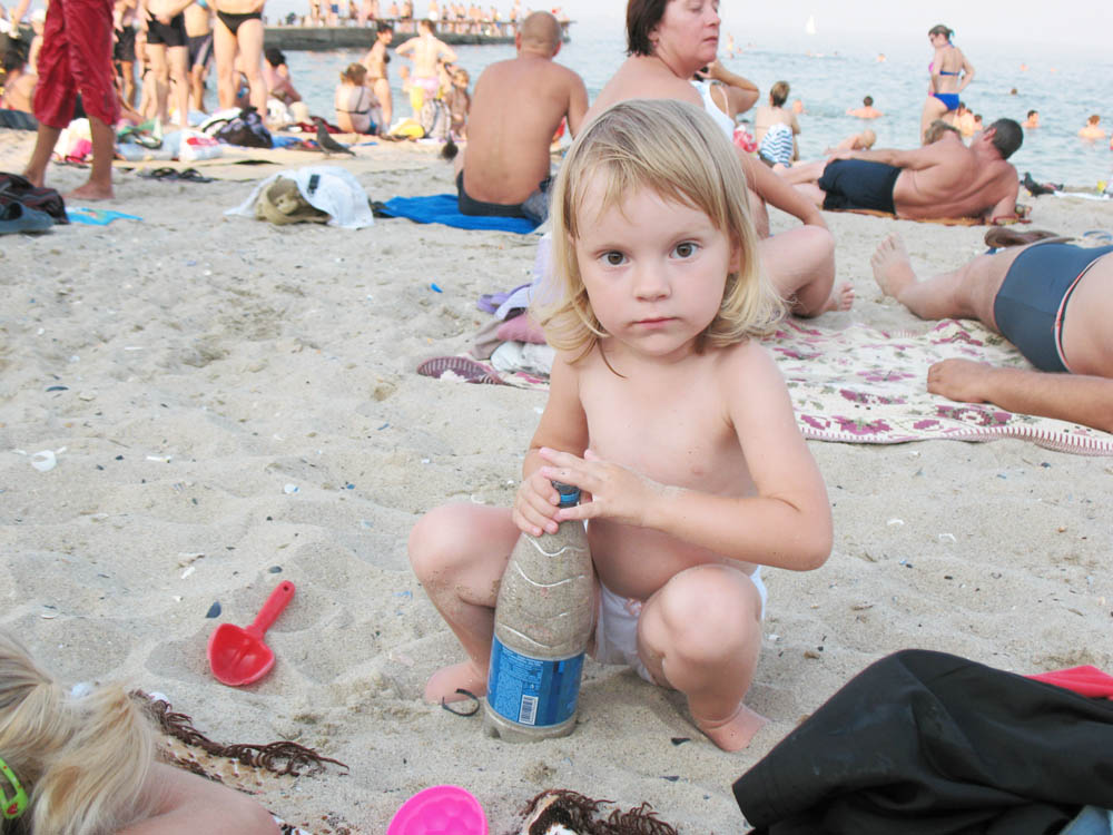 Поскольку я побаиваюсь высоты, мне был не слишком комфортен спуск, и все 425 метров пока мы ехали я старался не дышать и не смотреть по сторонам. Покинуть кабинку - это тоже еще то приключение, опять же, моей супруге это далось легко, мне же с моими вещами при сходе удалось зацепиться чем-то за кабинку, отчего она сильно закачалась, за что я получил несколько грозных слов от тетеньки, стоящей на нижней платформе. Моей дочери катание на канатной дороге тоже не принесло удовольствия и мы решили, что обратно в гору мы пойдем пешком. Выйдя с платформы канатной дороги мы оказались на Одесском пляже в Отраде. Этот пляж поделен на небольшие участки. Вход на первые два участка был платным, поэтому мы прошли мимо, и вошли на пляж на третьем участке. Пляж был также песчаным, но по сравлению с пляжем Затоки он был ОЧЕНЬ замусоренным и, кроме того, на нем было очень много людей. Мы едва ли нашли кусочек песка где-то в пятом-шестом ряду от моря.