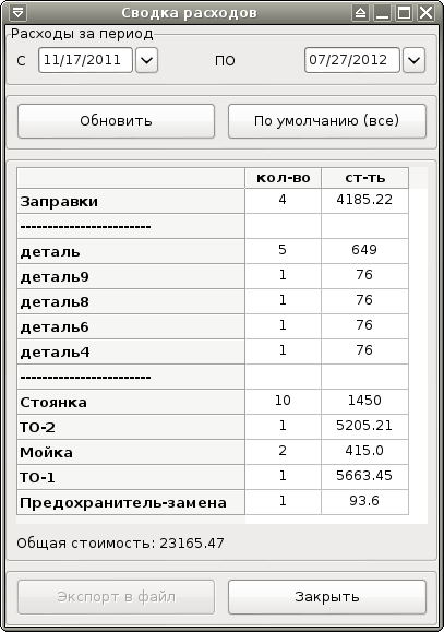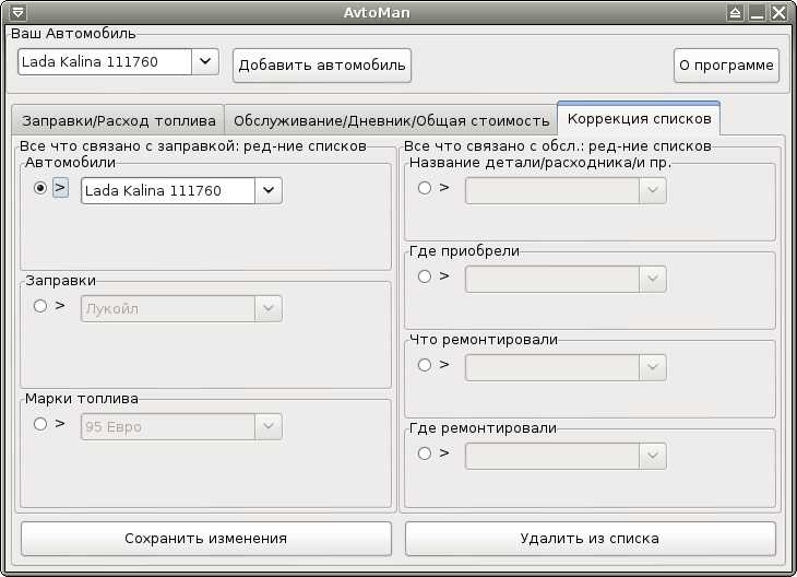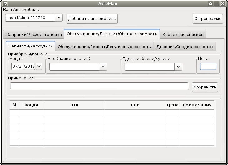 В эпоху расцвета наладонников с удовольствием пользовался MyPal, с установленным 'Автоменеджер 1.05' — расход топлива, расходы на обслуживание-ремонт по узлам, дневник и пр. Крайне удобная штука, хотя и не без недостатков. В последствии для дальних и не очень поездок и вообще для мобильного пользования был приобретен, за какие-то смешные деньги, 'Asus EEE PC900', который верой и правдой служит мне вот уже, если не ошибаюсь, четвертый год. Крутится на нем Arch Linux+Open Box. И все бы хорошо - только не нашел я под Linux ничего такого, что бы сошло за 'Автоменеджер' (может быть плохо искал) вот и пришлось в конце концов наваять эту приблуду самому. Строго говоря, это GUI, написанный на wxPython, для sqlite базы. Предлагаемая версия годится, как для Linux, так и Windows (во всяком случае под WindowsXP работает точно, в отношении других версий не знаю — под рукой нет попробовать). Все компоненты, использованные для создания этой программки, являются легально бесплатными! , также как и она сама.
