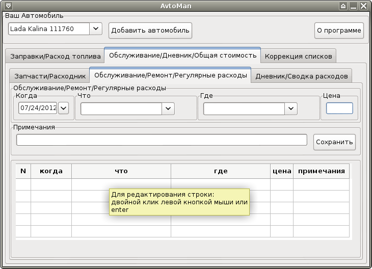 В эпоху расцвета наладонников с удовольствием пользовался MyPal, с установленным 'Автоменеджер 1.05' — расход топлива, расходы на обслуживание-ремонт по узлам, дневник и пр. Крайне удобная штука, хотя и не без недостатков. В последствии для дальних и не очень поездок и вообще для мобильного пользования был приобретен, за какие-то смешные деньги, 'Asus EEE PC900', который верой и правдой служит мне вот уже, если не ошибаюсь, четвертый год. Крутится на нем Arch Linux+Open Box. И все бы хорошо - только не нашел я под Linux ничего такого, что бы сошло за 'Автоменеджер' (может быть плохо искал) вот и пришлось в конце концов наваять эту приблуду самому. Строго говоря, это GUI, написанный на wxPython, для sqlite базы. Предлагаемая версия годится, как для Linux, так и Windows (во всяком случае под WindowsXP работает точно, в отношении других версий не знаю — под рукой нет попробовать). Все компоненты, использованные для создания этой программки, являются легально бесплатными! , также как и она сама.