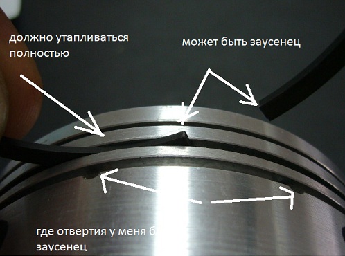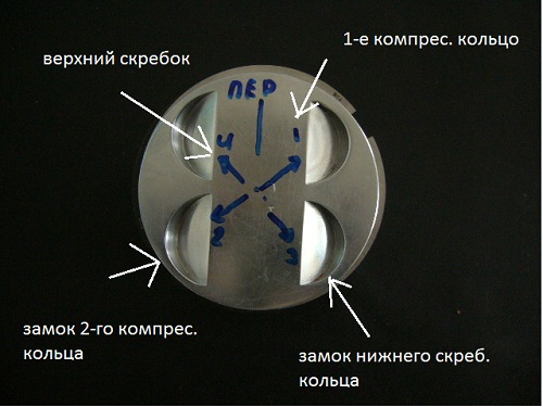 Далее потренировался в установке колец в поршень, сначала установил нижнее скребковое м\с кольцо далее пружину тут необходимо очень внимательно чтобы замок пружины не был внахлест на одной из фото постарался нарисовать, далее верхнее скребковое, скребковые можно не боятся они стальные, компрессионные одевал без всяких приспособ просто аккуратно покрутил кольца в канавках остался доволен, снял колечки положил на место. Замки колец относительно друг друга и поршня расположил как показано на фото. Насколько правильно все с кольцами проделал пока не знаю, надеюсь что кто то что подскажет и еще вот ссылка на один форум как правильно ставить скребковые кольца насколько достоверно не знаю, но себе ставлю так. http://www.audi-club.ru/forum/showthread.php?t=130164