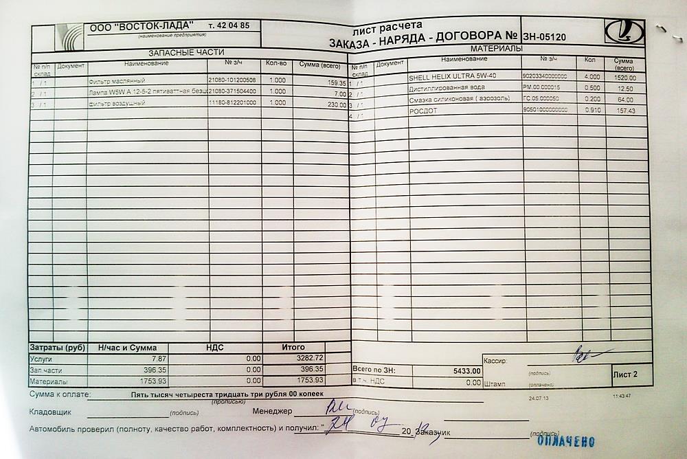 Первый раз мне на ТО проверили АКБ и долили воду. Ещё поменяли лампочку габаритов. Из косяков, как обычно, перелили масло в двигатель, пришлось дома с помощью шприца откачивать 200 мл (стало по максимуму).