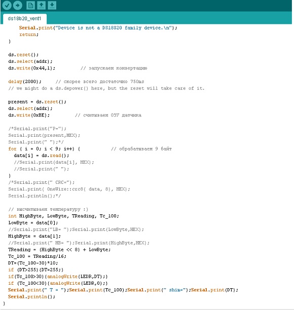 Получил ардуино http://magazin48.ru/Detal39559306.html и датчик температуры качаем прогу http://arduino.cc/en/Main/Software качаем библиотеку http://www.pjrc.com/teensy/arduino_l...es/OneWire.zip Устанавливаем данную библиотеку в ардуино. Далее запускаем ардуино и делаем как на фото №1. Это костяк программы для данного датчика, немного поправляем, и программа готова. На 2и 3 фото уже так называемая написанная программа, тут писать можно много, но кому интересно по этим вопросам очень много литературы и форумов. Опишу основное: формула ее видно на фото №3; DT=(Tc_100-30)*10; означает если температура (Тс_100) к примеру равна 30 градусам, то (30-30)*10 =0. т.е. DT (ДТ это ШИМ) =0; если к примеру температура равна 43 градуса (43-30)*10= 133 получается DT=133 это чуть более 50% ШИМ т.е. двигатель вращается примерно 50% от полной мощности, соответственно при температуре 55 градусов двигатель будет вращаться на полную мощность. На эти цифры можно внимание не обращать, это я записал для опытов. Вместо вентилятора кондиционера подключил вент с компа а к датчику температуры подносил паяльник и смотрел как все работает. Цифрами можно играться как хочешь, к примеру при давлении в трубке 14 бар у меня температура трубки должна быть 55 градусов, (вентилятор вращается 50%) а при 65 градусах давление 17бар) должен вращаться 100% тогда формула должна выглядеть так: DT=(Tc_100-40)*10; 55-40=15*10=150 – это чуть больше 50% ШИМ (ШИМ меняется от 0 до 255, это от 0 до 100%) при температуре 65 получается 65-40=25*10=250 это почти 100%, думаю принцип понятен.