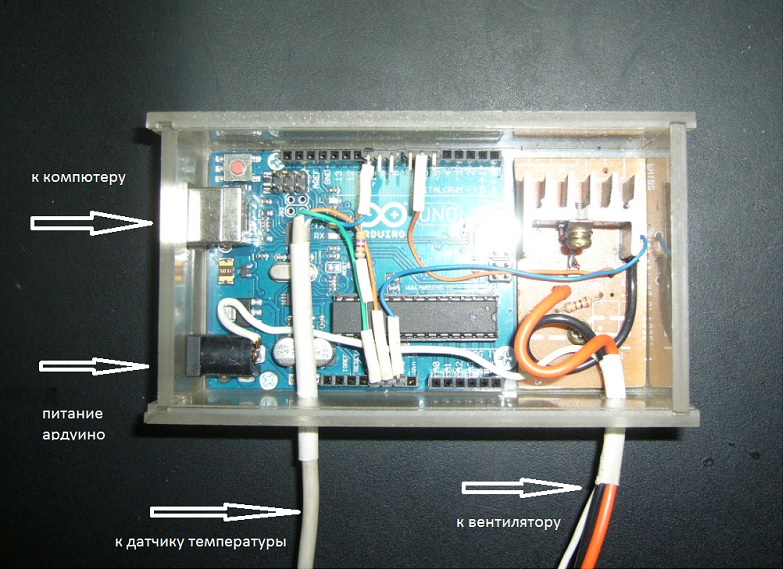 На рис. №4 принципиальная схема (если так можно назвать) датчик питается 5В от ардуино и сигнал с датчика температуры приходит к 10 входу ардуино. С 6 выхода идет ШИМ и поступает на силовой полевой транзистор, который и управляет вентилятором. Параллельно вентилятору стоит диод VD- 1 у него защитная функция транзистора, подойдет любой (не стеклянный) диод с током порядка 3 А. К датчику температуры провод взял от старой мышки, сам датчик решил к трубке высокого давления крепить при помощи двух медных полуколец скрепленных двумя винтами, на фото все видно. Начал проводить эксперименты «на столе», все получается очень не плохо, потеплеет, попробую все установить и проверить работу уже в боевых условиях. Ардуино пока только начал изучать, очень интересно.