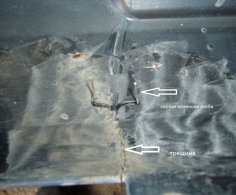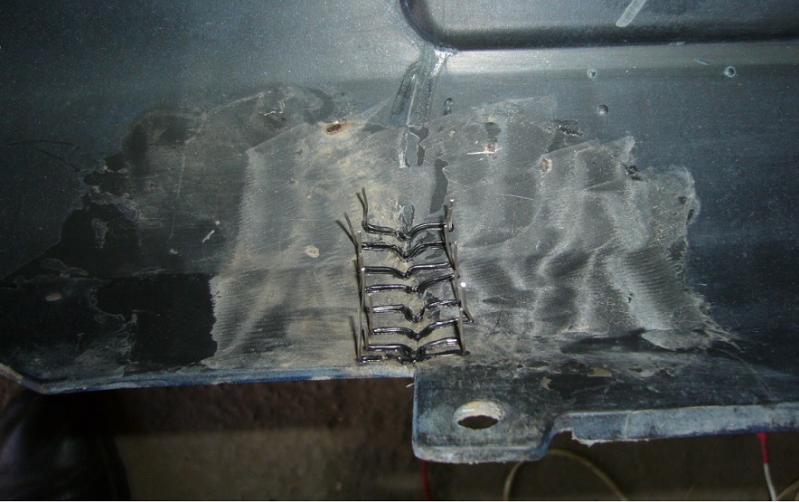Поддев ножом за край латки, она естественно отскочила, оголив трещину (фото 1, 2.) Для ремонта из подручных материалов сделал небольшое приспособление. Суть заключается в следующем: взял два латунных штырька диаметром 4мм (размер и материал не имеют значения) с торца каждого штырька просверлил отверстие диаметром 1мм на глубину 10мм. Ручку сделал из старого паяльника, саму кнопку из контакта какого то старого реле, тут из чего делать роли не играет, что в гараже валяется, то и пойдет. В общем, писать долго, на фото все видно. Далее из нихрома 0,8 при помощи пинцета и пассатижей согнул скобу и вставил в отверстия, которые в торце прудка. Провода кинул на аккумулятор. При нажатии на супер-пупер выключатель естественно нихром раскалиться до красна, но этого не надо. Просто, нажимая – отпуская, добиваемся вплавление скобы в пластик примерно на середину толщины бампера. Далее кнопку отпускаем, и через несколько секунд скоба намертво впаевается в бампер. Можно мне не верить, но я даже не тренировался, все очень просто и что самое главное, быстро. Делается данная процедура одной рукой, второй прижимал бампер так, чтобы трещина была сжата, и края на одном уровне. После установки скоб, откусил концы кусачками и чуть болгаркой, те места, где скобы все же выступали после кусачек (фото 7). Перевернул бампер (фото 8), углубил слегка трещину и зашкурил место шпаклевки (фото 9) и зашпаклевал (10), далее дело техники. На все про все, времени потратил в районе часа, не считая времени изготовления приспособы, которое заключается в переборке хлама в гараже в поисках то проводочка, то штырьков.