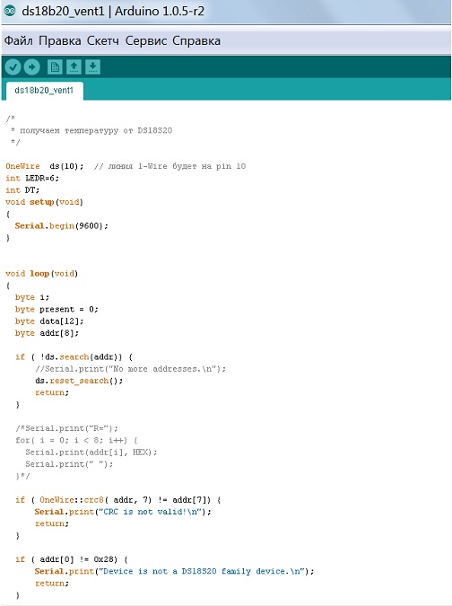 Получил ардуино http://magazin48.ru/Detal39559306.html и датчик температуры качаем прогу http://arduino.cc/en/Main/Software качаем библиотеку http://www.pjrc.com/teensy/arduino_l...es/OneWire.zip Устанавливаем данную библиотеку в ардуино. Далее запускаем ардуино и делаем как на фото №1. Это костяк программы для данного датчика, немного поправляем, и программа готова. На 2и 3 фото уже так называемая написанная программа, тут писать можно много, но кому интересно по этим вопросам очень много литературы и форумов. Опишу основное: формула ее видно на фото №3; DT=(Tc_100-30)*10; означает если температура (Тс_100) к примеру равна 30 градусам, то (30-30)*10 =0. т.е. DT (ДТ это ШИМ) =0; если к примеру температура равна 43 градуса (43-30)*10= 133 получается DT=133 это чуть более 50% ШИМ т.е. двигатель вращается примерно 50% от полной мощности, соответственно при температуре 55 градусов двигатель будет вращаться на полную мощность. На эти цифры можно внимание не обращать, это я записал для опытов. Вместо вентилятора кондиционера подключил вент с компа а к датчику температуры подносил паяльник и смотрел как все работает. Цифрами можно играться как хочешь, к примеру при давлении в трубке 14 бар у меня температура трубки должна быть 55 градусов, (вентилятор вращается 50%) а при 65 градусах давление 17бар) должен вращаться 100% тогда формула должна выглядеть так: DT=(Tc_100-40)*10; 55-40=15*10=150 – это чуть больше 50% ШИМ (ШИМ меняется от 0 до 255, это от 0 до 100%) при температуре 65 получается 65-40=25*10=250 это почти 100%, думаю принцип понятен.