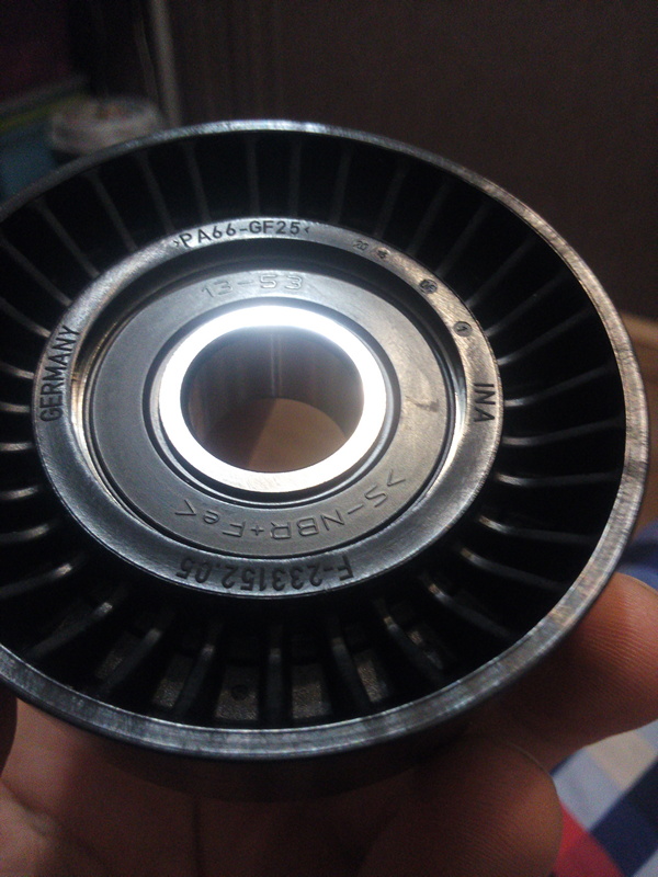 Поменял натяжной генератора на ина (531076010 ina/luk). Родной ролик гены впринципе не имел ни люфтов, ни подкусываний, но крутился тоже легко и посуху.