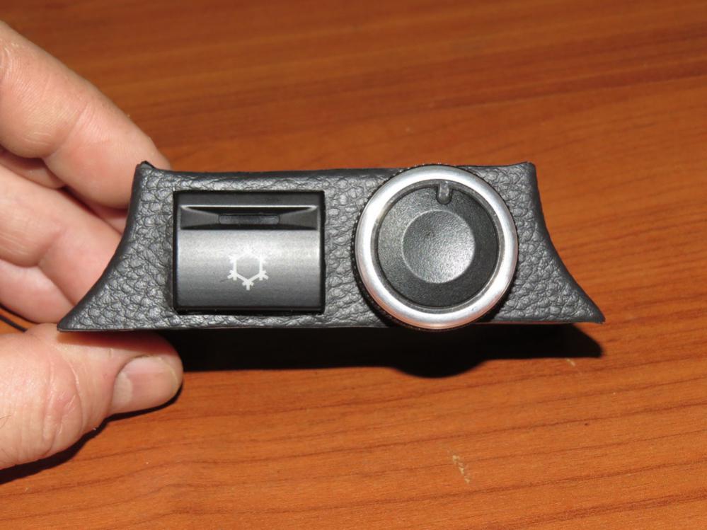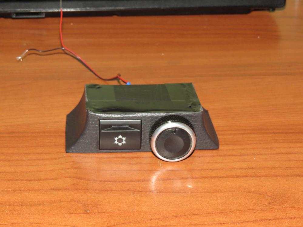 В качестве основы пошел на распил корпус старого тоннеля. Из него по снятым выкройкам спаял короб под одну кнопку и резистор регулятора. Резистор из регулятора пришлось выпаять. Подогнал корпус по месту и перетянул винил-кожей. В качестве ручки регулятора подобрал ручку от отопителя иномарок.